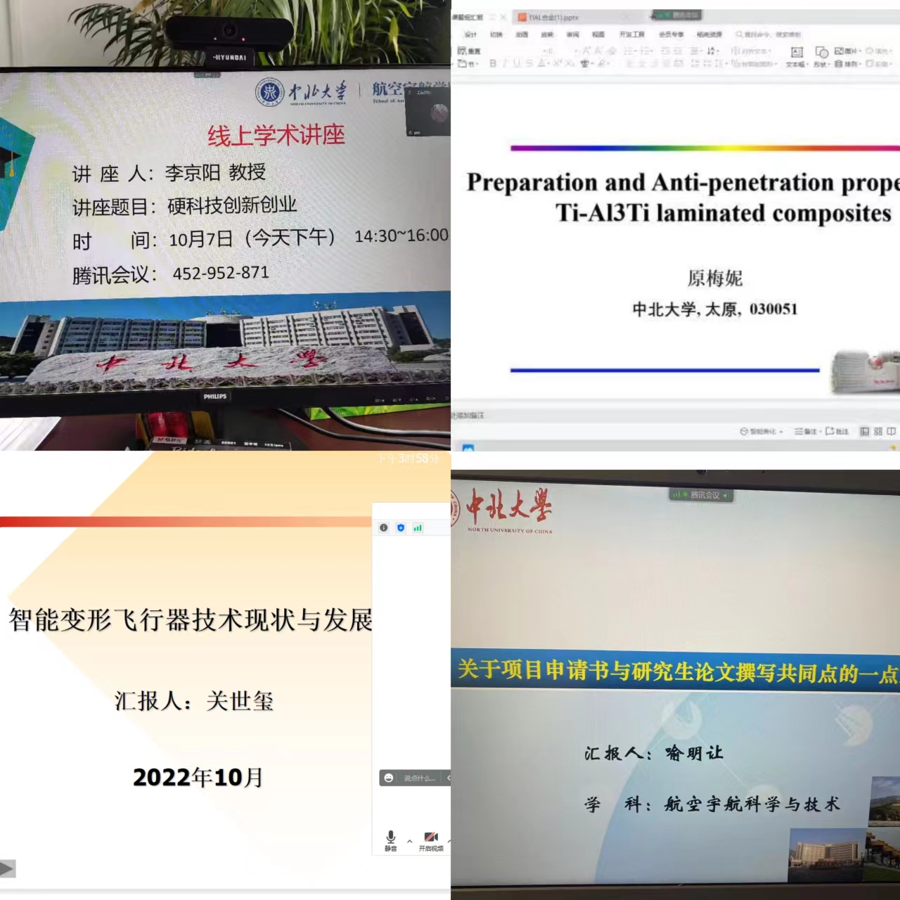 还有七位教师分别开展了各自研究领域中的相关热点技术讲座。其中,关世玺老师举办了《智能变形飞行器技术现状与发展》讲座,陈鹏云老师举办了《国外重点研究的水下无人机系统技术》讲座,喻明让老师举办了《关于项目申请书与研究生论文撰写共同点的一点思考》讲座,原梅妮老师举办了《preparation and Anti-penetration properties of Ti-Al3Ti laminated composites》讲座,郭拉凤老师举办了《镁及镁合金材料》讲座,范志强老师举办了《基于薄膜传感器的柔性压力测量技术》讲座,韩文梅老师举办了《煤瓦斯吸附解吸特征与规律研究》讲座。