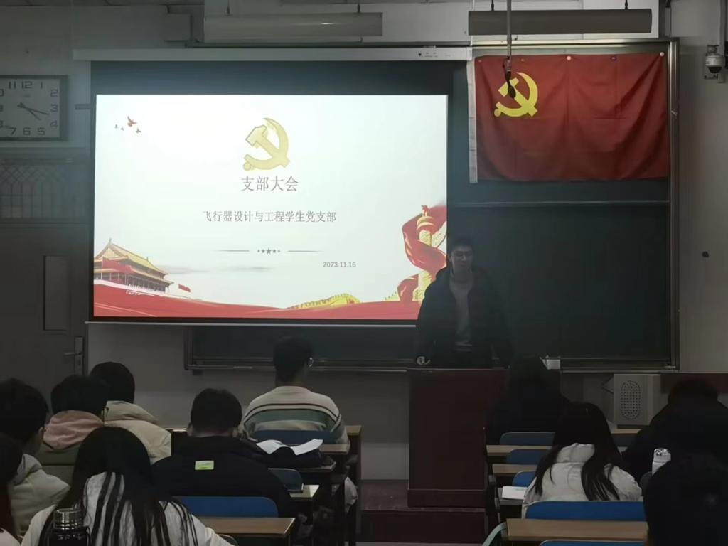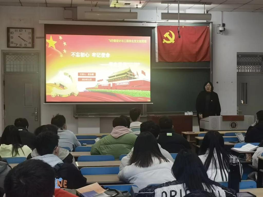 2023年11月16日下午4时,飞行器设计与工程学生党支部在11306H教室召开了支部大会,由党支部书记段志薇老师进行了以“不忘初心 牢记使命——学生党员‘三问’”为主题的党课教育。