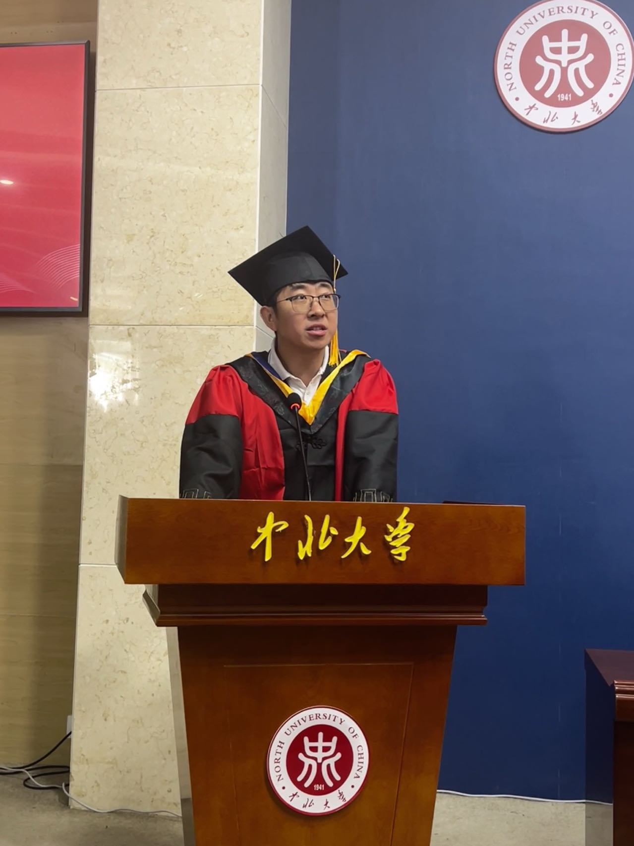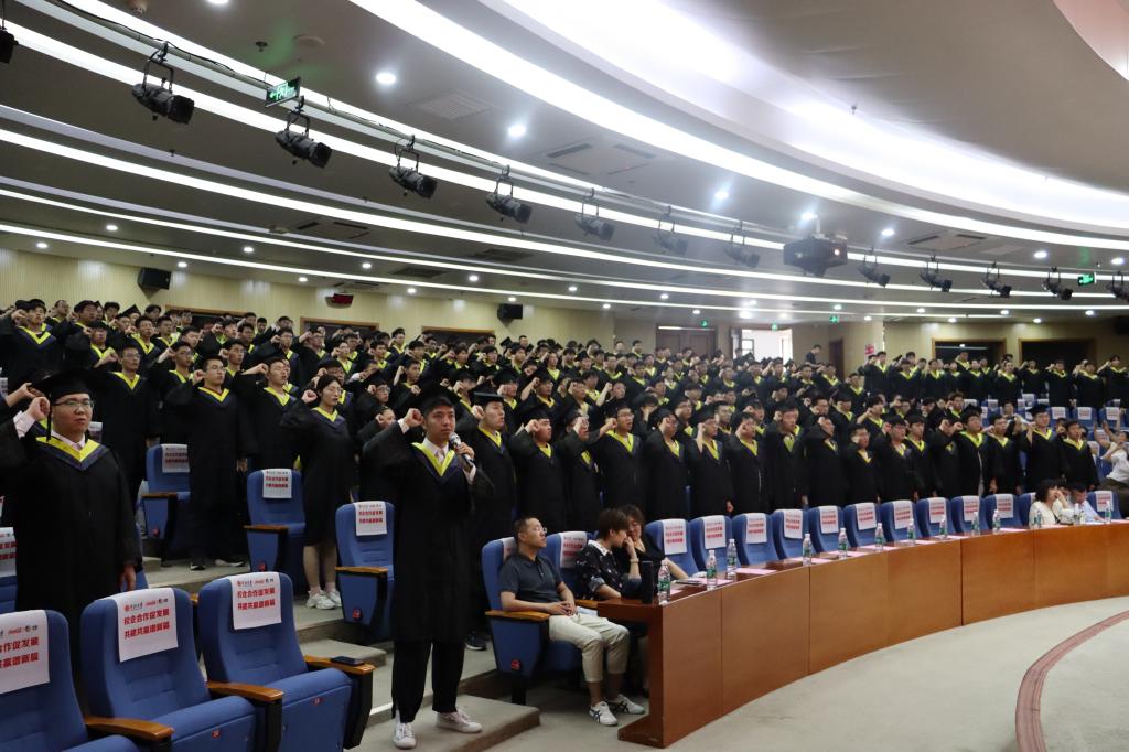 曹璟琦同学作为毕业生代表登台发言,他首先向老师们对毕业生四年来的辛勤培育表示了衷心的感谢。他感慨四年大学生活转瞬即逝,回顾了自己在学业道路上的宝贵经历和快乐时光,并表示此次典礼不仅是一场告别,更是一个新的开始。赵芸龙同学作为在校生代表发言,他向即将踏上新征途的毕业生们表示祝贺,也向辛勤耕耘、无私奉献的老师们致以最崇高的敬意,并表示在校生应该珍惜校园时光,努力学习,积极参与社会实践,不断提升自我,为将来步入社会打下坚实的基础,努力成长为国家和社会的支柱。学生代表刘晓澎带领2024届毕业生进行毕业宣誓,铿锵有力的声音展现了他们最真诚的内心。