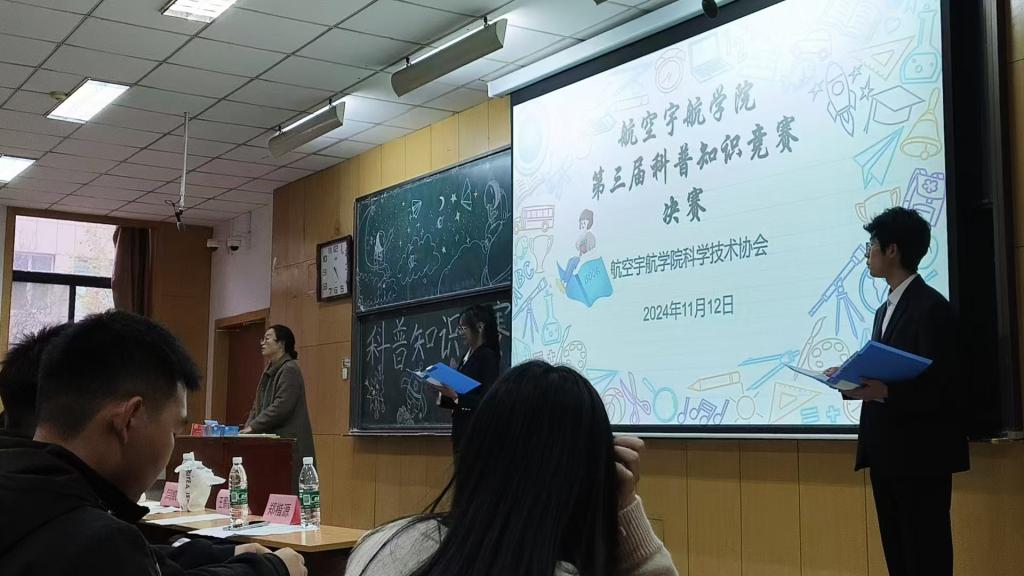 接着,竞赛正式开始。本次竞赛通过设置风采展示、必答题、抢答题和风险题以及水火箭答辩等环节,全面考验选手们的知识储备和应变能力。一开始每支队伍通过PPT介绍自己的风采;在必答题环节,选手们沉着冷静,凭借扎实的科普知识功底,纷纷给出准确答案,比分一度呈现胶着状态;而到了抢答题环节,气氛瞬间紧张起来,选手们全神贯注盯着抢答器,手速飞快,每一次抢答成功并答对都引得现场观众阵阵掌声;风险题环节更是充满挑战,各队根据自身情况谨慎选题,有的选择高分值高难度题目放手一搏,有的则稳扎稳打选取相对容易的题目,这一环节充分展现了选手们的策略智慧;水火箭答辩环节为第三届科普知识竞赛新添内容,结合航院特色,考察参赛队员的团队协作能力和动手能力。除了台上选手们的激烈比拼,台下观众也热情高涨。他们认真聆听每一道题目,时而为选手们的精彩表现欢呼喝彩,时而因答错题目而发出惋惜之声。在互动环节,不少观众还积极参与答题,展现出对科普知识的浓厚兴趣。
